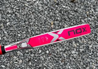 Pala de pádel NOX ML10 PRO CUP en venta. Poco uso. - Diseño blanco con detalles en rosa y plateado. - Logo de NOX y makes you improve en la cara. - Firma de jugador en la parte superior derecha.