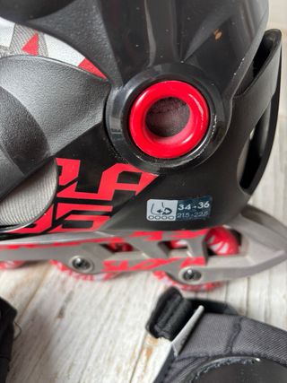 Patines en línea Oxelo en color negro, rojo y gris, ideales para niños y niñas. Talla 32-34. - Cierre con velcro y hebilla. - Ruedas de 70mm. - Incluye bolsa de transporte.