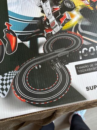 Pista de carreras de coches a escala. - Diseño de pista en forma de ocho. - Incluye dos coches de carreras. - Mandos de control para los coches. Esta nuevo en su caja