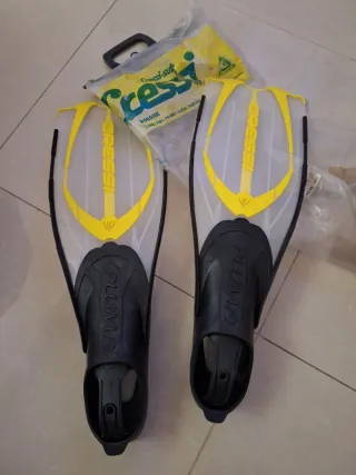 Aletas de buceo Cressi Pluma en color blanco y amarillo. Son talla 45/46. - Marca: Cressi - Modelo: Pluma - Talla: 45/46