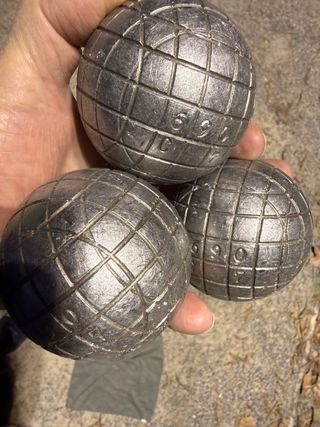 Conjunto de tres bolas de petanca. - Modelo CX COU. Peso 680 Diámetro 74 - Grabado OP57