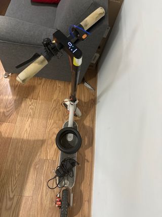 Patinete eléctrico Xiaomi Mi en color negro y tonos azules. Incluye cargador Xiaomi y un neumático de repuesto de la misma casa, Xiaomi. - Manillar con puños ergonómicos. - Freno delantero y trasero. - Plegable para facilitar su transporte. Muy poco uso, las dos ruedas cambiadas recientemente. Como nuevas. Falta añadir la luz trasera.