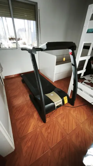 Cinta de correr Domyos TC-140 de Decathlon. En buen estado general. Es una máquina ideal para andar o trotar en casa, muy estable y con sistema de plegado para ahorrar espacio. - Diseño plegable para fácil almacenamiento. - Superficie de carrera amplia. - Panel de control con pantalla. - Estructura robusta y estable. - Velocidad: Hasta 13 km/h. La cinta tiene un ligero deslizamiento puntual. Posiblemente necesite lubricación con silicona (mantenimiento básico de estas máquinas). Por lo demás, el motor y la electrónica están impecables.
