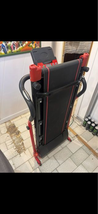 Cinta de correr eléctrica RunnerFit Sprint, modelo plegable con Pulsómetro, Portabotellas, Brazos de Agarre de Espuma, Pantalla LED, 12 Programas, hasta 14 km/h, Peso Máximo 110 Kg - Diseño compacto y fácil de almacenar. - Superficie de carrera amplia. - Empuñaduras ergonómicas. Lo unico que necesita es un arreglillo en el hierro, como podeis apreciar en una de las imagenes. Por lo demas esta bien. Funciona perfectamente aunque arreglar primero el hierro antes de usar.