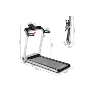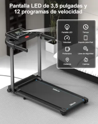Cinta de correr compacta y plegable, ideal para entrenar en casa. Cuenta con una superficie de 38x100cm. - Pantalla LED de 3,5 pulgadas. - 12 programas de velocidad. - Soporte para iPad. - Portavasos integrado. - Llave de seguridad. - Indicadores de distancia y calorías.