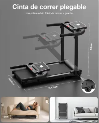 Cinta de correr compacta y fácil de guardar. - Diseño plegable. - Función de inclinación ajustable. Con panel para controlar la velocidad y también con mando a distancia, también tiene un soporte para dejar el móvil, tablet.. Con su libro de instrucciones