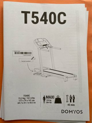 Cinta de correr DOMYOS T540C en perfecto estado. - Panel de control con pantalla LCD. - Programas de entrenamiento preestablecidos. - Botones de inicio/pausa y parada de emergencia. - Ajuste de inclinación y velocidad.