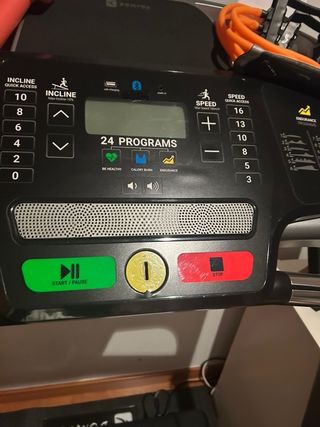 Cinta de correr DOMYOS, completamente nueva y sin usar. - Panel de control con pantalla LCD. - Botones de inicio/pausa, stop, y ajuste de velocidad (+/-). - Incluye sistema de seguridad con pinza.