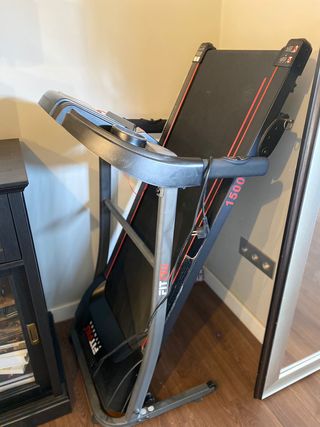 Cinta de correr comprada en Amazon. La compramos hace unos años pero debido al poco espacio en casa la hemos usado un par de veces. Está prácticamente nueva, los plásticos de los paneles (los botones) siguen puestos, se puede plegar como se ve en la quinta foto. Si tienes alguna duda no te cortes en preguntar, la cinta está muy bien, las reseñas en amazon lo corroboran.