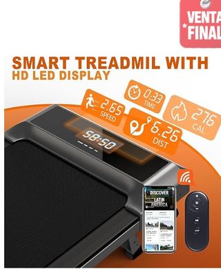 REBAJADL porque necesito hacer hueco en casa. Estaba puesta a 140€, costó 320€ hace 2 años. Cinta de correr con motor de 2.5 HP y velocidad máxima de 12 km/h. Se puede utilizar plegada y poner de ajo de una mesa, genial para teletrabajo. Todavía tiene hasta los plásticos la pantalla sin quitar. - Incluye mando a distancia para un control fácil. - Superficie de carrera amplia y cómoda. - Diseño plegable para ahorrar espacio. Tiene un pequeño roce que se muestra en una foto, no afecta para nada al uso.