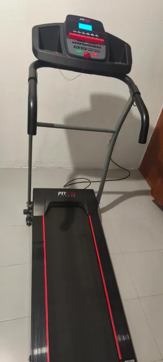 Cinta de correr eléctrica FITPRO en color negro con detalles en rojo. - Diseño moderno y compacto. - Superficie de carrera negra. - Detalles laterales en color rojo. Poco uso