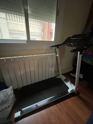 Cinta de correr eléctrica Domyos RUN 100, ideal para entrenar en casa. Su diseño plegable permite guardarla fácilmente. - Superficie de carrera amplia. - Pantalla digital con información del entrenamiento. - Estructura robusta y estable. Ofrece hasta 14 km/h de velocidad, inclinación manual del 3%, 30 programas de entrenamiento y una superficie de carrera de 120x45 cm, soportando hasta 130 kg. La he usado como maximo unos 5 o 6 veces. Tiene ruedas en 2 direcciones asi que se puede mover por casa facilmente. No tengo posibilidad de llevarla a ningun sitio, deberiais venir a buscarla a mi casa.