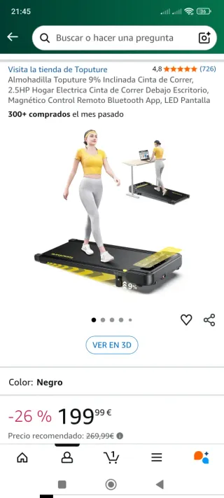 Nueva. Usada 1–2 veces. Precio en Amazon: 199,99 € Cinta de correr eléctrica Toputure con inclinación del 9% y motor de 2.5HP. Ideal para usar en casa o debajo de un escritorio. - Control remoto Bluetooth y app. - Pantalla LED. - Diseño compacto y plegable. -------- ikea / zara / Leroy Merlín /