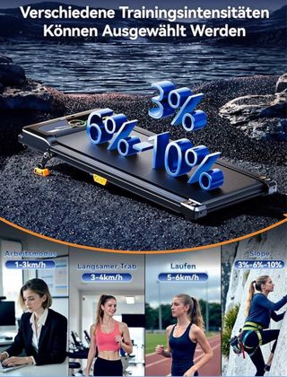 ajuste preciso del ángulo de inclinación en 3 niveles, inclinaciones seleccionables del 3 %, 6 % y 10 %, combinadas con un rango de velocidad de 1 a 8 km/h con un control remoto sensible que le permite ajustar fácilmente la velocidad con un motor potente y silencioso de 2,5 CV y cuenta con seis amortiguadores en la parte inferior, lo que reduce el ruido durante el entrenamiento a menos de 45 dB La capacidad de carga máxima es de 150 kg la pantalla LED de alta resolución muestra en tiempo real los cuatro datos más importantes: calorías, tiempo, velocidad y distancia Con dos ruedas en la parte inferior