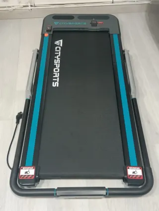 Cinta de correr CITYSPORTS en excelente estado, utilizada muy pocas veces. - Diseño moderno con detalles en naranja. - Superficie de carrera negra. - Logo de CITYSPORTS visible.