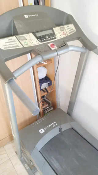Cinta de andar Domyos TC4 en buen estado. - Panel de control con pantalla. - Botones de inicio, pausa y parada. - Indicadores de velocidad y distancia.