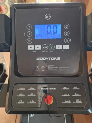 Cinta de correr Bodytone DT17 en buen estado. - Pantalla digital con información de velocidad, tiempo, distancia y calorías. - Botones de acceso rápido para velocidad. - Conexión USB y MP3. - Programas preestablecidos (P1-P12). - Botón de parada de emergencia. Hay q bajarla un tramo de escaleras hasta el ascensor