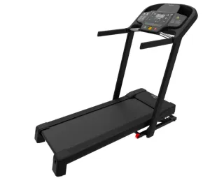Cinta de correr para entrenamientos en casa. - Diseño compacto. - Superficie de carrera negra con detalles rojos. - Panel de control con botones circulares.