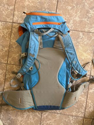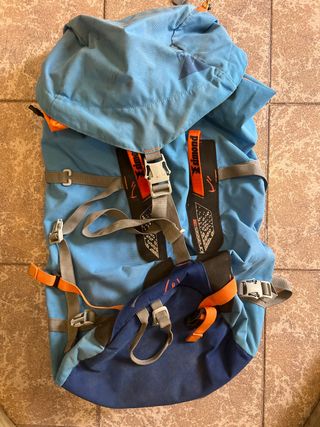 Mochila de montaña Simond Jorases con capacidad de 40+5 litros. esta un poco sucia en las fotos, pero se acaba de limpiar en la lavadora como nueva - Color azul claro y azul marino. - Cintas de ajuste y correas de hombro. - Cierre de hebillas. - Detalles en naranja.