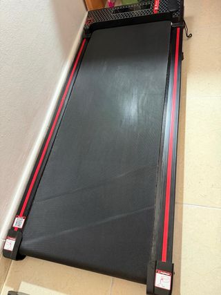 Cinta de correr y caminar, ideal para mantenerte activo en casa. Su diseño permite guardarla fácilmente. - Superficie de carrera negra. - Bandas laterales rojas. - Panel de control superior.