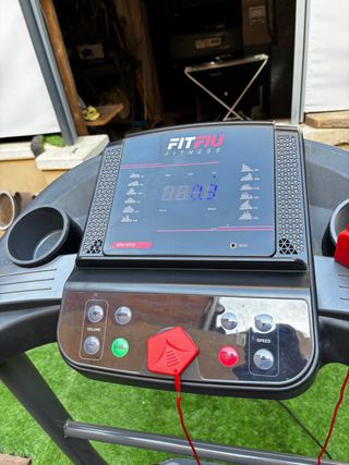 Cinta de correr de la marca FitFiu. - Panel de control con pantalla digital. - Soporte para botellas. - Botones de control de volumen y velocidad. - Sistema de seguridad con clip.