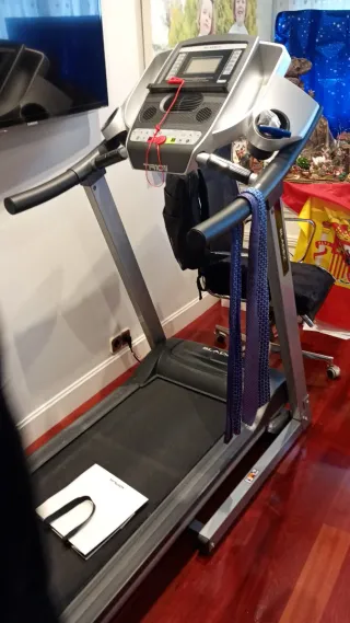 Cinta de correr que he usado tres veces contadas, aún tiene plásticos que no llegué a quitarle. Para uso ocasional o intensivo. Vel. hasta 12 Km/h. Superficie de carrera de 109.5 x 39.5 cm. y sistema de amortiguación VCS, pulsadores de control de velocidad en las barras laterales y de sensor de pulso monitorizado mediante sensor de manos. Pantalla LCD multifunción que incluye: Distancia recorrida, Calorías consumidas, Tiempo transcurrido y pulsaciones, Velocidad de marcha. Tres niveles de condición física. Se pliega fácilmente, Inclinación ajustable manualmente, Peso máximo del usuario 120 kg.