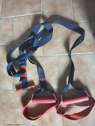 Sistema de entrenamiento con cintas TRX, ideal para ejercicios de fuerza y resistencia. - Correas de nylon resistentes. - Asas ergonómicas rojas. - Sistema de ajuste. - Incluye anclaje.