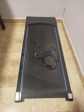 Cinta de correr eléctrica, ideal para mantenerte activo en casa. Su diseño es compacto y fácil de almacenar. - Superficie de carrera negra. - Bandas laterales de color azul. - Incluye mando a distancia y cable de alimentación.