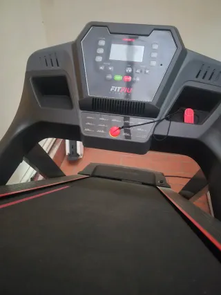 Cinta de correr FITFIU Fitness en color negro con detalles rojos. Casi Usada muy poco - Panel de control con pantalla. - Botones de inclinación y velocidad. - Botón de parada de emergencia rojo.