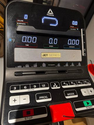 Cinta de correr Reebok Jet Series 100 en buen estado. - Pantalla digital con información de tiempo, velocidad y distancia. - Botones de acceso rápido para inclinación (3, 6, 9, 12) y velocidad. - Programas preestablecidos. - Función de modo. - Botón de parada de emergencia.