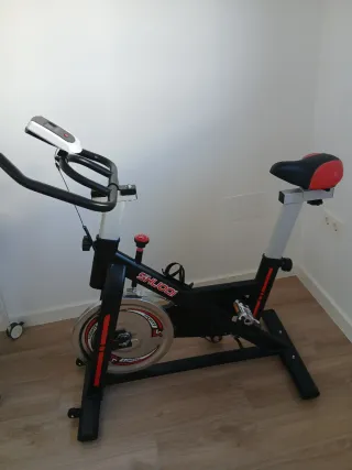 Bicicleta estática de color negro con detalles en rojo y naranja. Ideal para entrenamientos en casa. Se vende por no uso. - Diseño robusto y estable. - Asiento y manillar ajustables. - Manillar ergonómico. - Rueda de inercia. - Pedales con agarre. El precio original fue de 219€ (puedo enseñar el recibo).