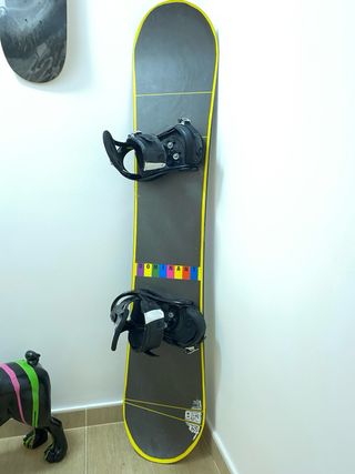 Tabla de snowboard con un diseño tabla de skate dominant. - Diseño multicolor con letras grandes. - Fijaciones y funda incluidas.
