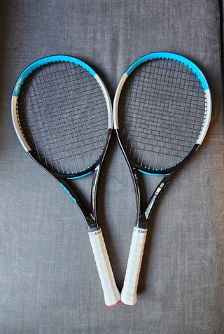 Oportunidad💥 2 Wilson Ultra V3 UL. Son iguales y están en buen estado con algunos raspones normal por el uso . Se puede ver en las fotos. precio por el par 💥 📍cabeza 100 📍peso 260 gr 📍cuerdas 16x19 📍puño 0 Cubregrip Wilson nuevos incluidos Hago envíos