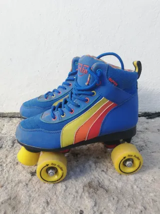 Patines estilo old school de la marca Rio Roller en color azul. Talla 37. - Diseño retro con franjas de colores (rojo, naranja, amarillo). - Ruedas amarillas con el logo de Rio Roller. - Cierre con cordones. - En perfecto estado.