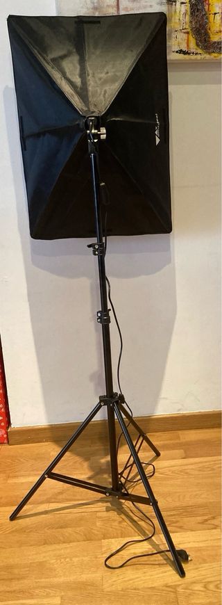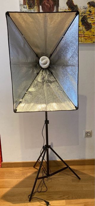 Equipo de iluminación para fotografía o video. - Softbox plateado. - Bombilla de bajo consumo incluida. - Soporte trípode ajustable. - Cable de alimentación. - Usado sólo 1 vez.