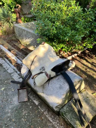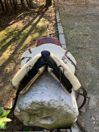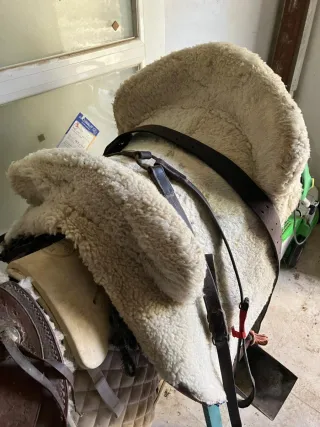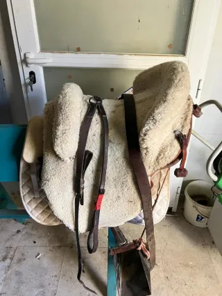 Montura española tradicional de cuero con forro de borrego. - Diseño clásico y funcional. - Materiales de calidad.