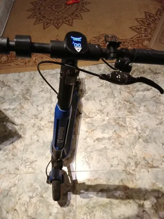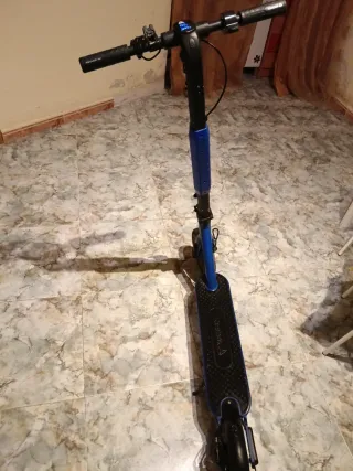 Patinete eléctrico de color azul con detalles en negro. Ideal para desplazamientos urbanos. - Manillar ajustable. - Plataforma antideslizante. - Ruedas negras.