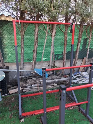 Equipo de entrenamiento para el hogar o gimnasio. - Estructura principal de metal gris. - Barras de agarre en color rojo. - Diseño estable para ejercicios.