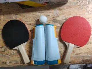 Set de ping pong con dos raquetas y red. - Una raqueta con goma negra. - Una raqueta con goma roja. - Red de ping pong con soportes ajustable hasta 190cm