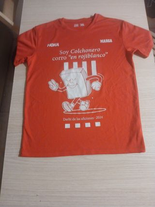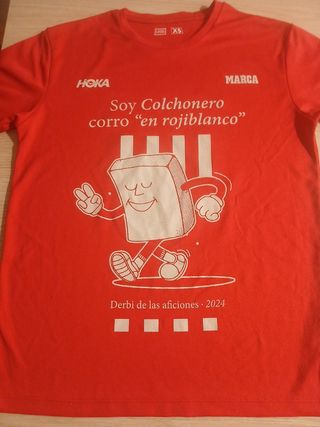 Camiseta oficial del Atlético de Madrid conmemorativa del Derbi de las Aficiones 2024. Perfecta y cómoda para correr,talla XS - Diseño Soy Colchonero corro 'en rojiblanco'. - Logos de HOKA y MARCA. - Talla XS.