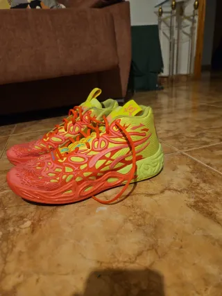 Zapatillas de baloncesto MB.04 con el diseño 1Love. - Color principal rosa con detalles en amarillo y rojo. - Cordones rojos. - Diseño gráfico distintivo en toda la zapatilla.