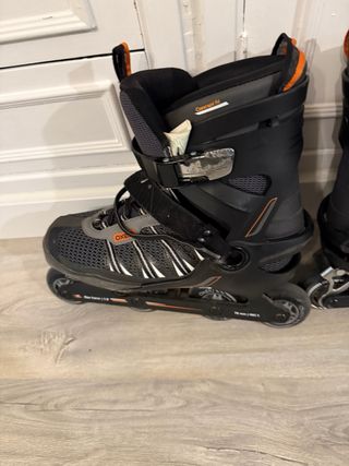 Patines en línea de la marca Oxelo de Decathlon. Son adaptativos y abarcan las tallas 26, 27 y 28. Las ruedas se pueden poner en línea o una delante y dos atrás (en paralelo) para ganar en estabilidad. Están bastante usados, pero todavía se pueden aprovechar. Vienen con protecciones y bolsa para transportarlos.
