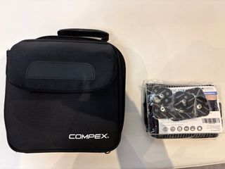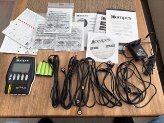Electroestimulador Compex SP 2.0 con accesorios. - Unidad principal Compex SP 2.0. - Cables de conexión. - Electrodos autoadhesivos. - Cargador. Comprado en junio 2025 y utilizado muy poco (solo dos electrodos grandes). Viene con bolsa de viaje.