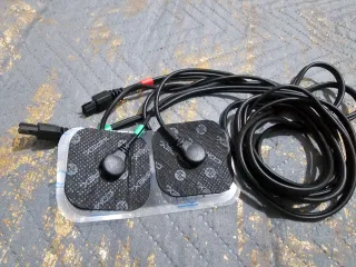 Electrodos y cables de la marca Compex. - Dos electrodos cuadrados con conexión. - Cable de conexión con conector estándar.