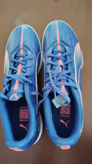 Zapatillas Puma para fútbol sala, talla 43. Están completamente nuevas y sin uso. - Diseño deportivo en azul y rosa. - Marca Puma. - Talla 43.