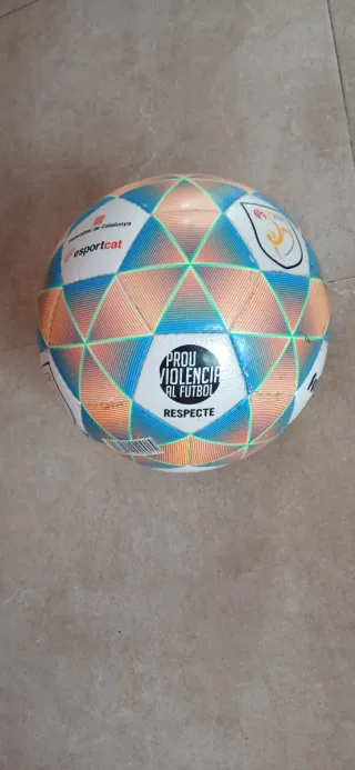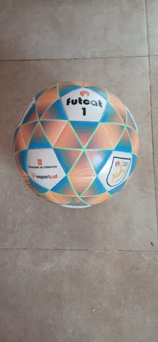 Pelota de fútbol Futcat, modelo 1, en excelente estado. - Diseño con paneles triangulares en tonos naranjas, azules y verdes. - Logos de Generalitat de Catalunya y esportcat visibles. - Insignia de la FCF (Federació Catalana de Futbol) en uno de los paneles.