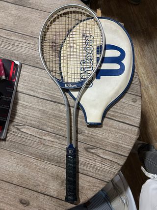 Raqueta de tenis vintage de la marca Wilson, ideal para jugadores de todos los niveles. Incluye funda. - Marco plateado. - Grip negro. - Logo de Wilson en la cabeza y en el grip.