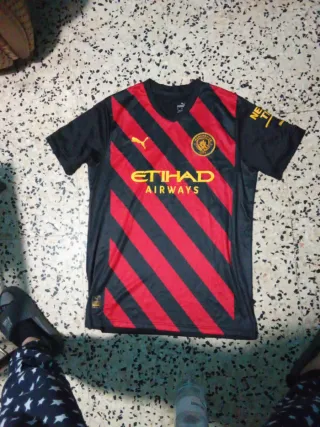 Camiseta de fútbol del Manchester City. - Diseño a rayas rojas y negras. - Logo de Puma y escudo del club. - Patrocinador Etihad Airways.