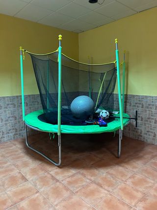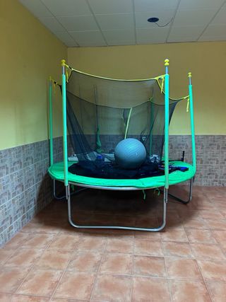 Cama elástica para disfrutar en casa o jardín. Incluye red de seguridad para mayor protección. - Estructura metálica. - Superficie de salto verde. - Red de seguridad negra.
