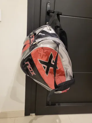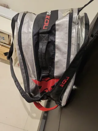 Bolsa de pádel de la marca NOX, con un diseño llamativo en rojo y plateado. - Compartimento principal espacioso. - Asas acolchadas para mayor comodidad. - Cierre con cremallera. - Puedes transportar por lo menos 4 palas, varios botes de bolas ydemás necesidades